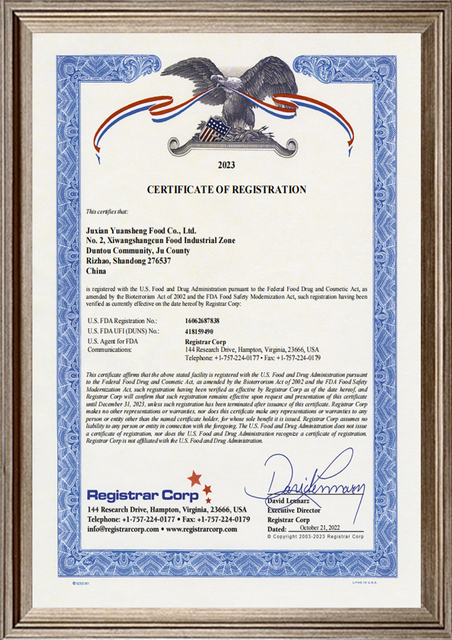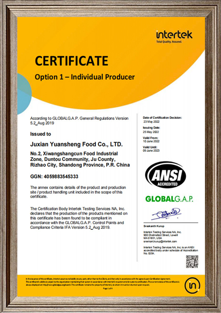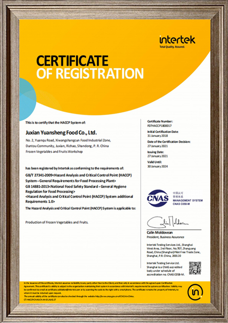 Juxian Yuansheng Food Co., Ltd. は 2016 年に設立された、冷凍野菜を輸出する民間株式会社です。